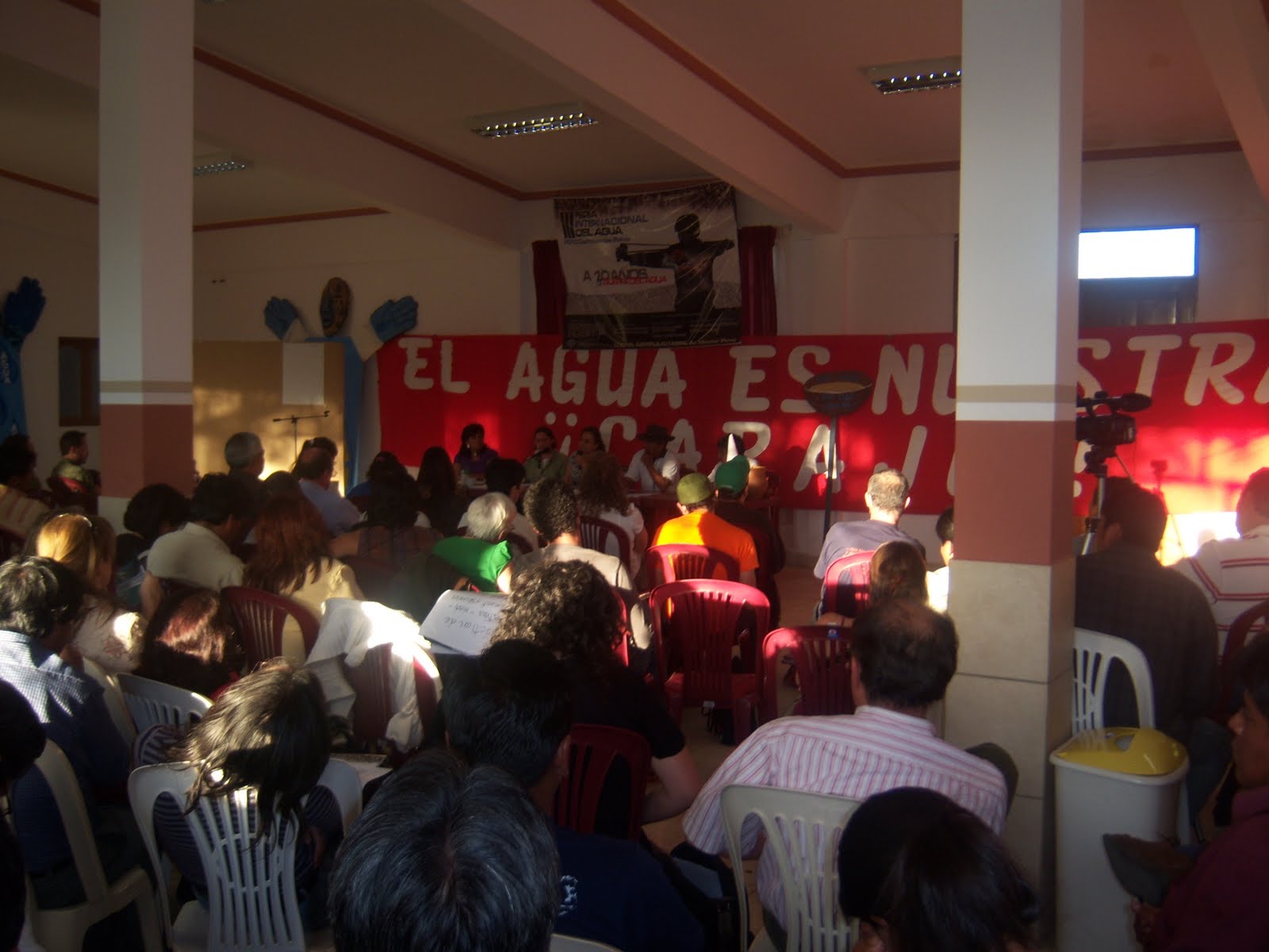 Se realizó entre el 16 y el 19 de abril en el predio del Complejo Fabril, propiedad del sindicato de fabriles de Cochabamba. En ese evento presenté una ponencia sobre el proyecto de Ley de Agua en Córdoba, definiendo el acceso al agua como un derecho humano esencial para la vida y que, por lo tanto, es el Estado el que debe garantizar un plan único de saneamiento con control de los trabajadores y usuarios, para que de una vez por todas todos tengan acceso al mismo y echemos definitivamente a las multinacionales que amasan fortunas y no dan el agua ni en cantidad, ni en calidad. Esta propuesta surgió de un debate colectivo a partir de la participación de asambleas barriales y vecinos que conformamos la Coordinadora en Defensa del Agua y de la Vida, como protagonistas fundamentales del proyecto de ley presentado en el año 2006.En Cochabamba sigue existiendo una aguda escasez e incluso falta absoluta de agua corriente en toda la zona sur, la más pobre de la ciudad. Por eso han surgido organizaciones comunitarias que proveen agua mediante cisternas o realizan algunas obras de saneamiento.